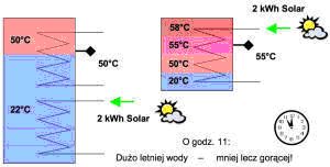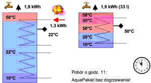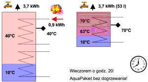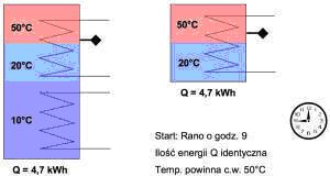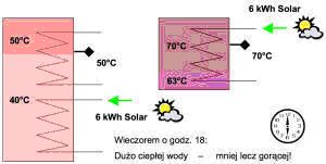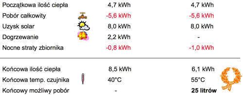 W układzie tradycyjnym mamy 8,6 kWh energii zmagazynowanej jednak temperatura spadła do 40 °C co powoduje konieczność dogrzania zbiornika