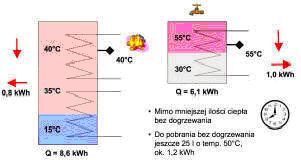 W układzie tradycyjnym temperatura spada do 40 °C co powoduje konieczność dogrzania zbiornika i dostarczenia z kotła 0,9 kWh energii